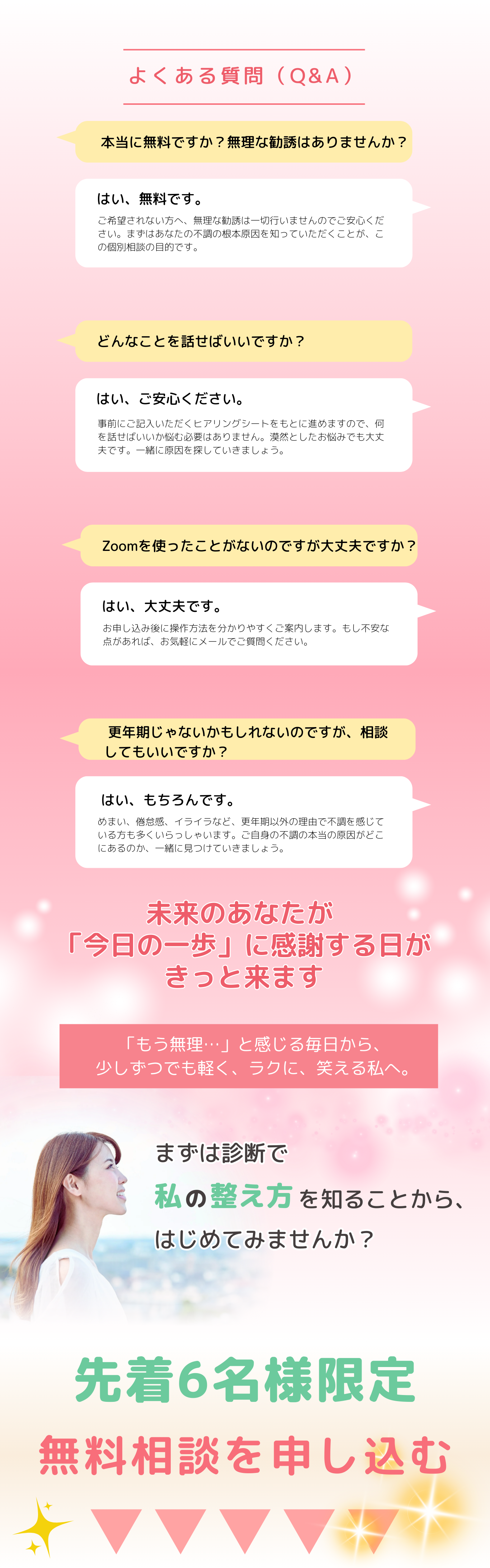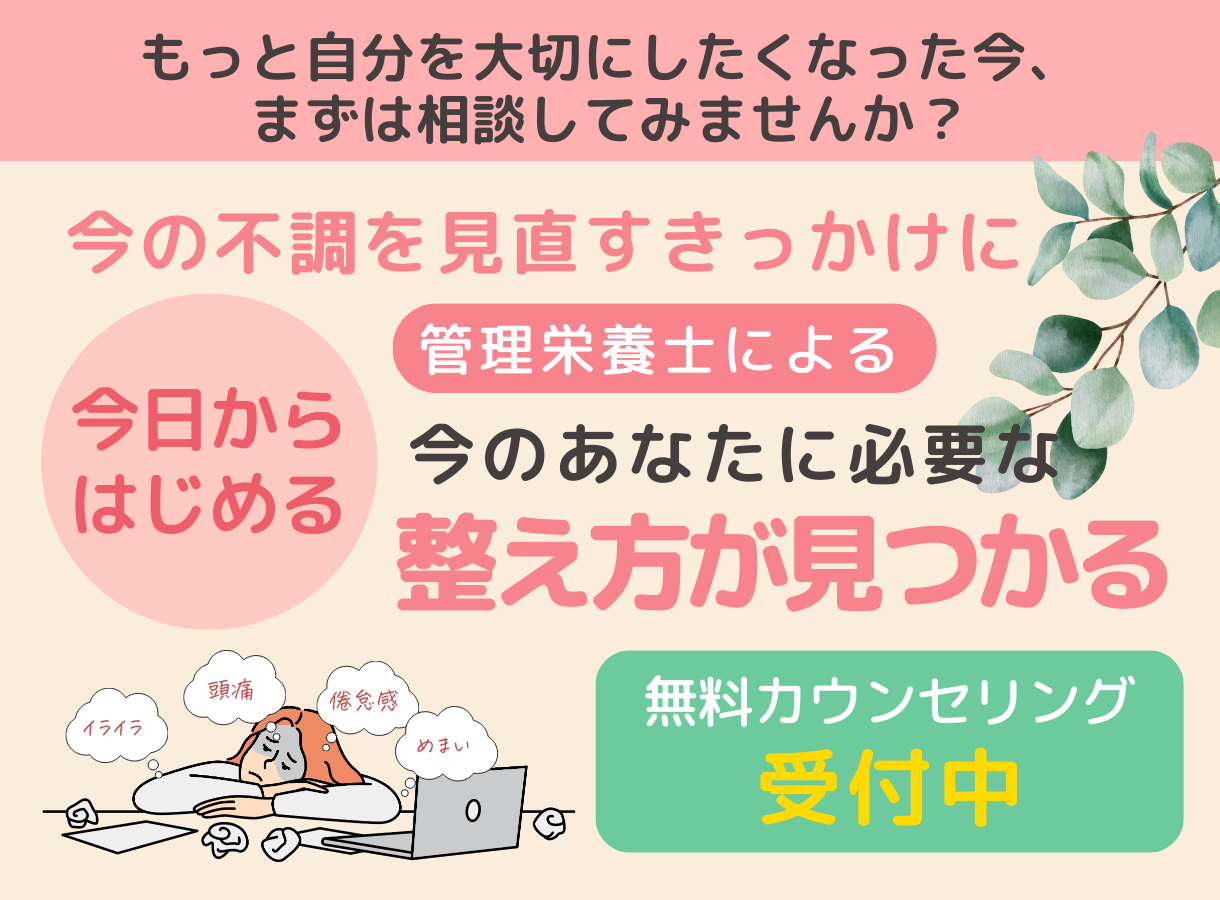 無料の個別相談では、あなたが何十年も抱えてきた不調の根本原因を、管理栄養士である私が一緒に見つけ出します。