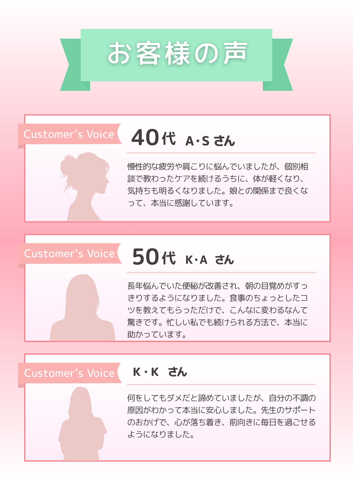 ・自己流では見つけられなかった、あなたの体質に合わせた食事やセルフケアのヒントを具体的にアドバイスします。